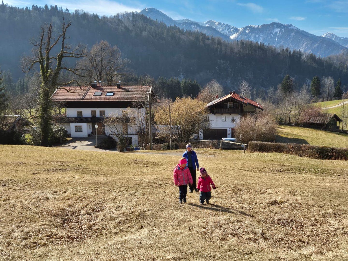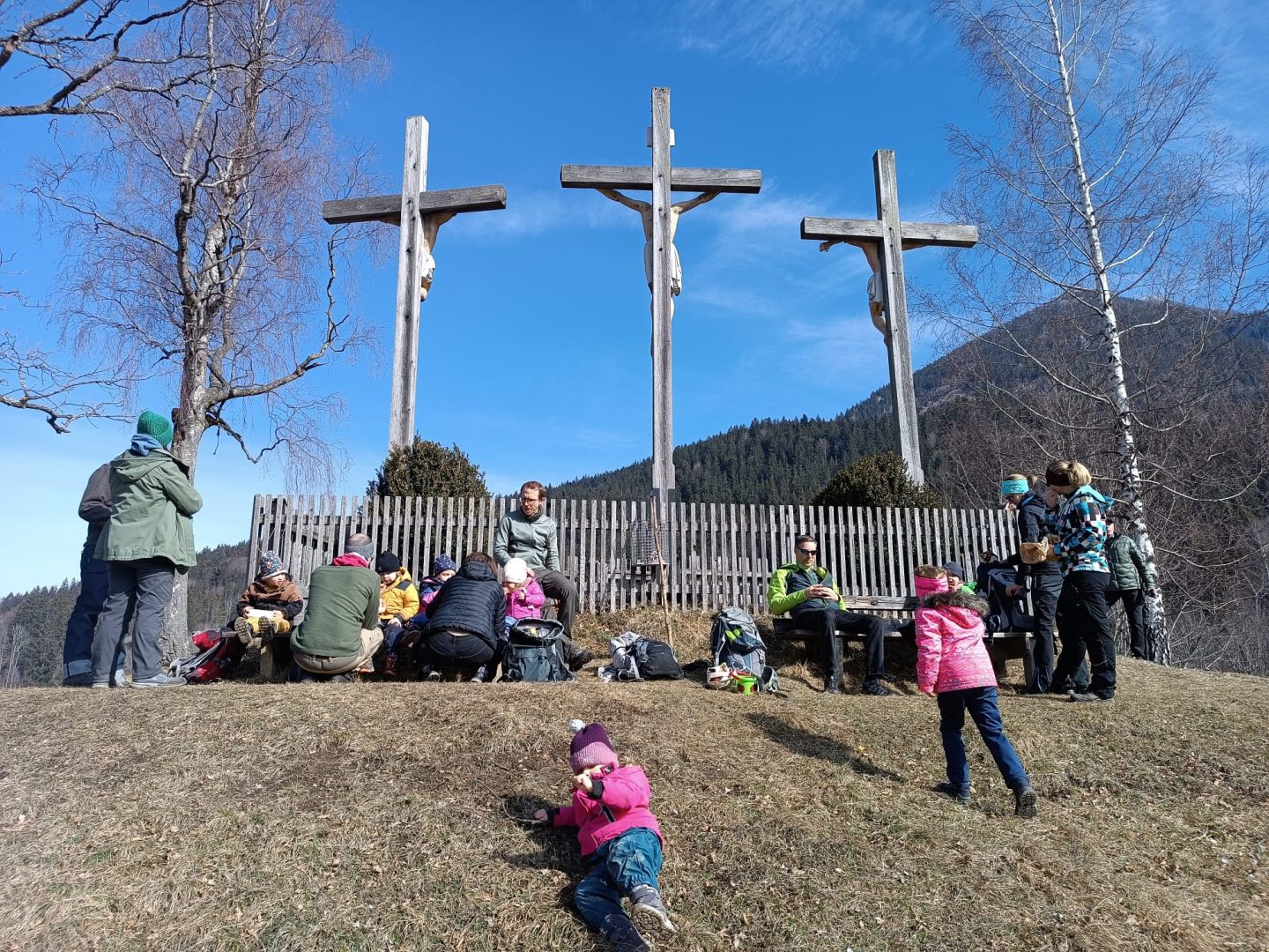 Frisch gestärkt erklommen die kleinen und großen Wanderer den heutigen „Gipfel“ mit seinen drei Kreuzen. Bei herrlichem Sonnenschein legten wir eine Pause ein, genossen das Panorama, die ersten blühenden Blumen und die große Wiese zum Herumtollen und -rollen.