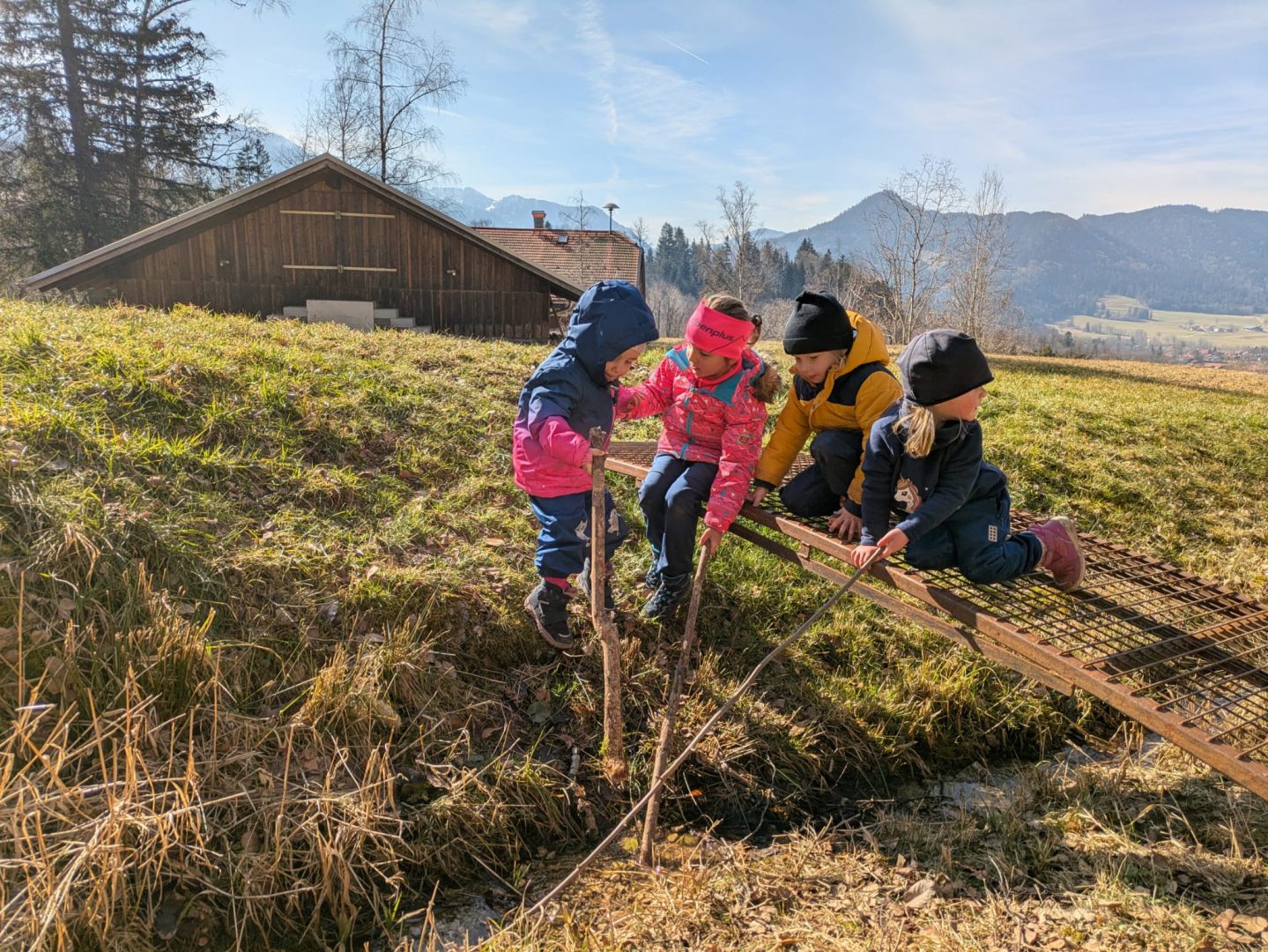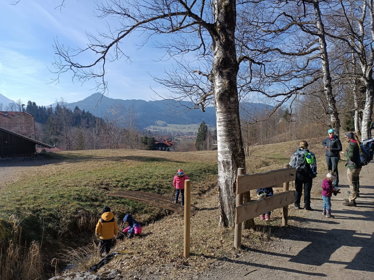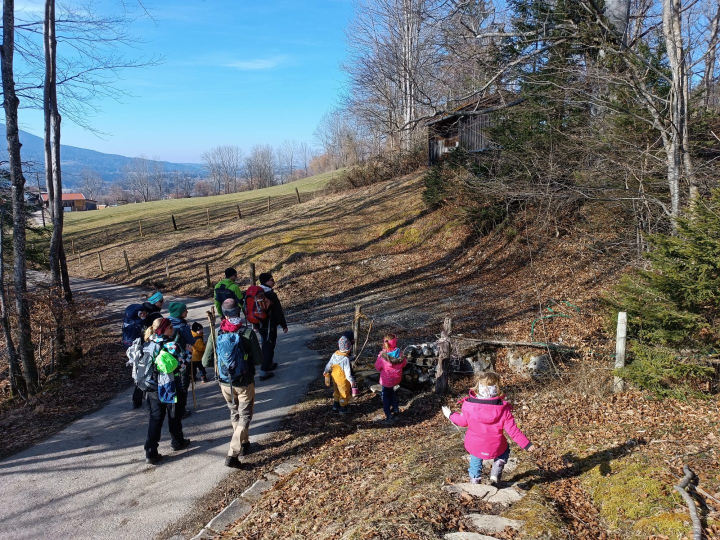 Auf dem Weiterweg begeisterte der mitgebrachte Würfel mit Tiermotiven: das Tier, das gewürfelt wurde, musste nachgeahmt werden. So liefen wir flott bis zur nächsten Kreuzung, an der wir nach einer kurzen Rast auf den einladenden Holzliegen den Abstieg starteten. Hierbei zeigten die Kinder wieder einmal ihre Kreativität: mit ihrem Spiel „Wir verstecken uns vor den Wölfen“ wurden auch die müden Kinder wieder munter und so ist auch der Abstieg entspannt verlaufen.