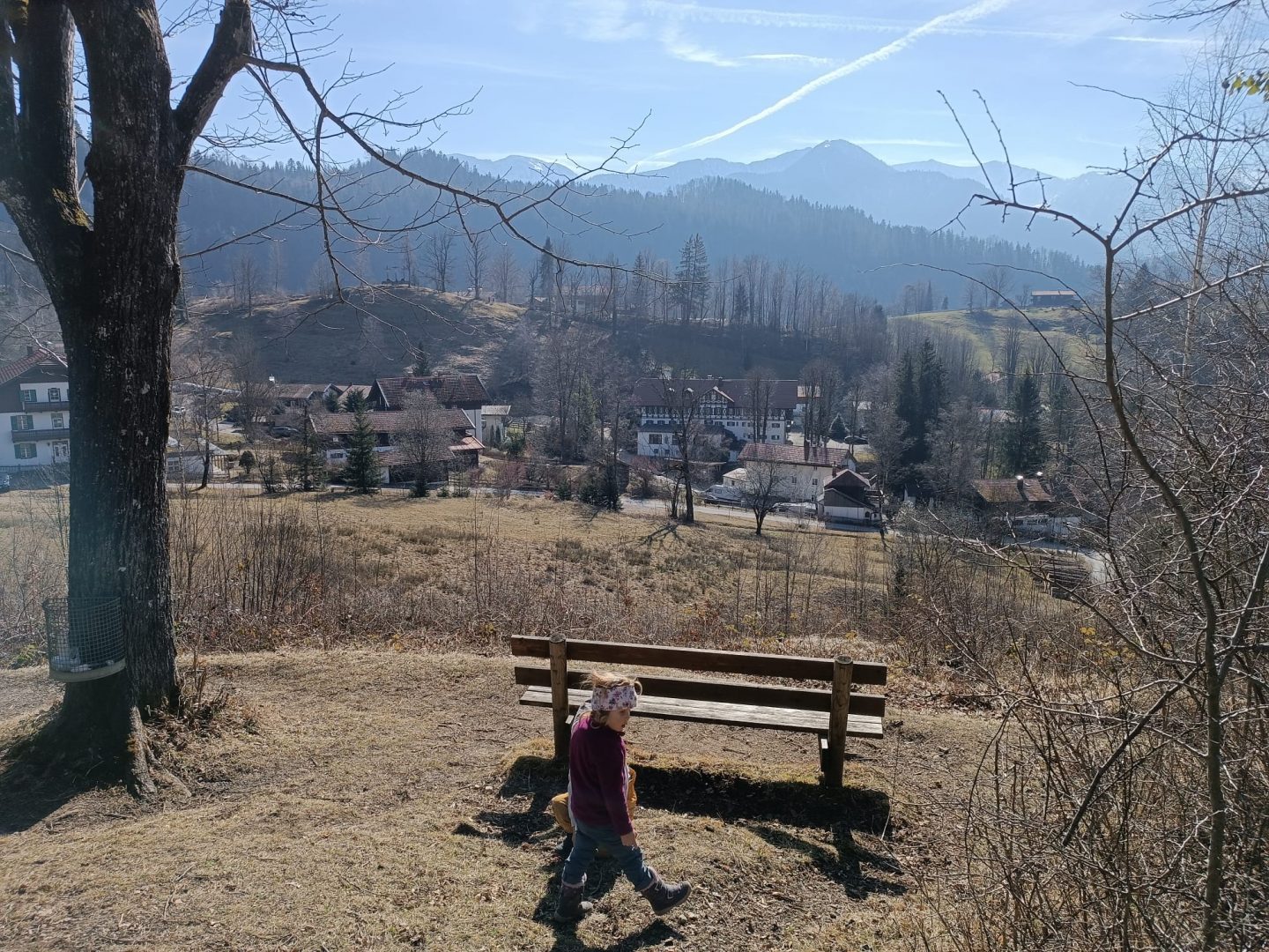 Und wie es bei unseren Touren so ist: die erste Picknickpause muss bereits nach (für uns Eltern) gefühlt erst 500 m Laufen sein. Da kam die nächste Bank, oberhalb der Spielwiese auf einem Hügel gelegen, mit tollem Panorama sehr gelegen.