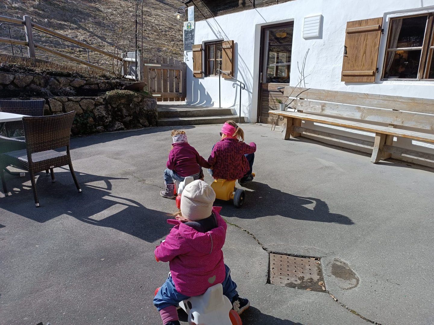 Weiter ging es zur Einkehr im Café, wo wir bei Frühlingswetter auf der Terrasse saßen und die Kinder sich noch etwas mit den Rutschfahrzeugen auspowerten.