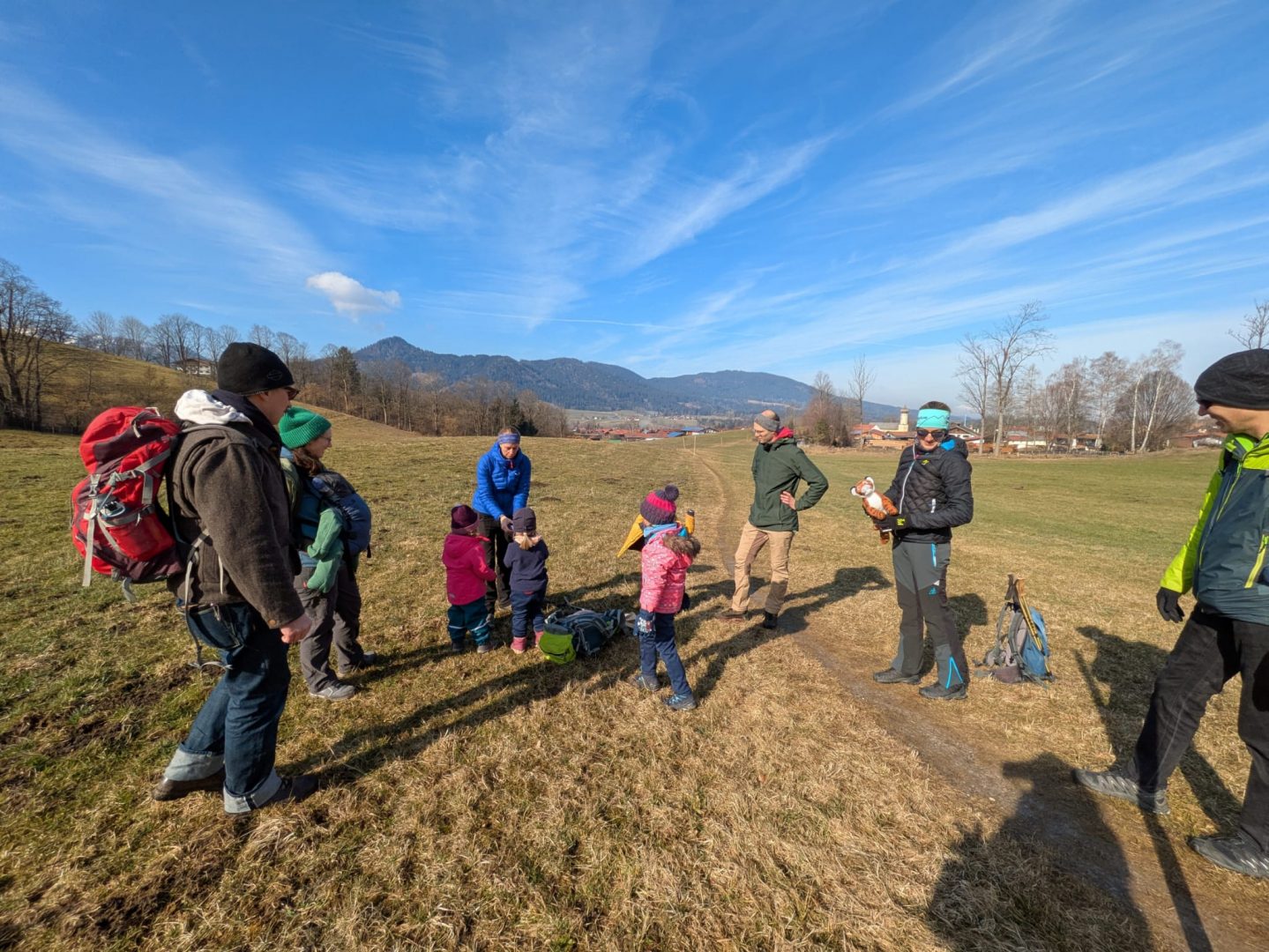 Bei Sonnenschein und angenehmen Temperaturen trafen wir uns am Parkplatz zu unserer Begrüßungsrunde: 6 Familien und unser Maskottchen, das Eichhörnchen Eddy, waren heute dabei. Nach der Vorstellung der heutigen Tour waren die Kinderkarten und Eddy so schnell unter den Kinder verteilt und wir alle bereit zum Losmarschieren, dass wir glatt das Begrüßungslied vergessen haben.