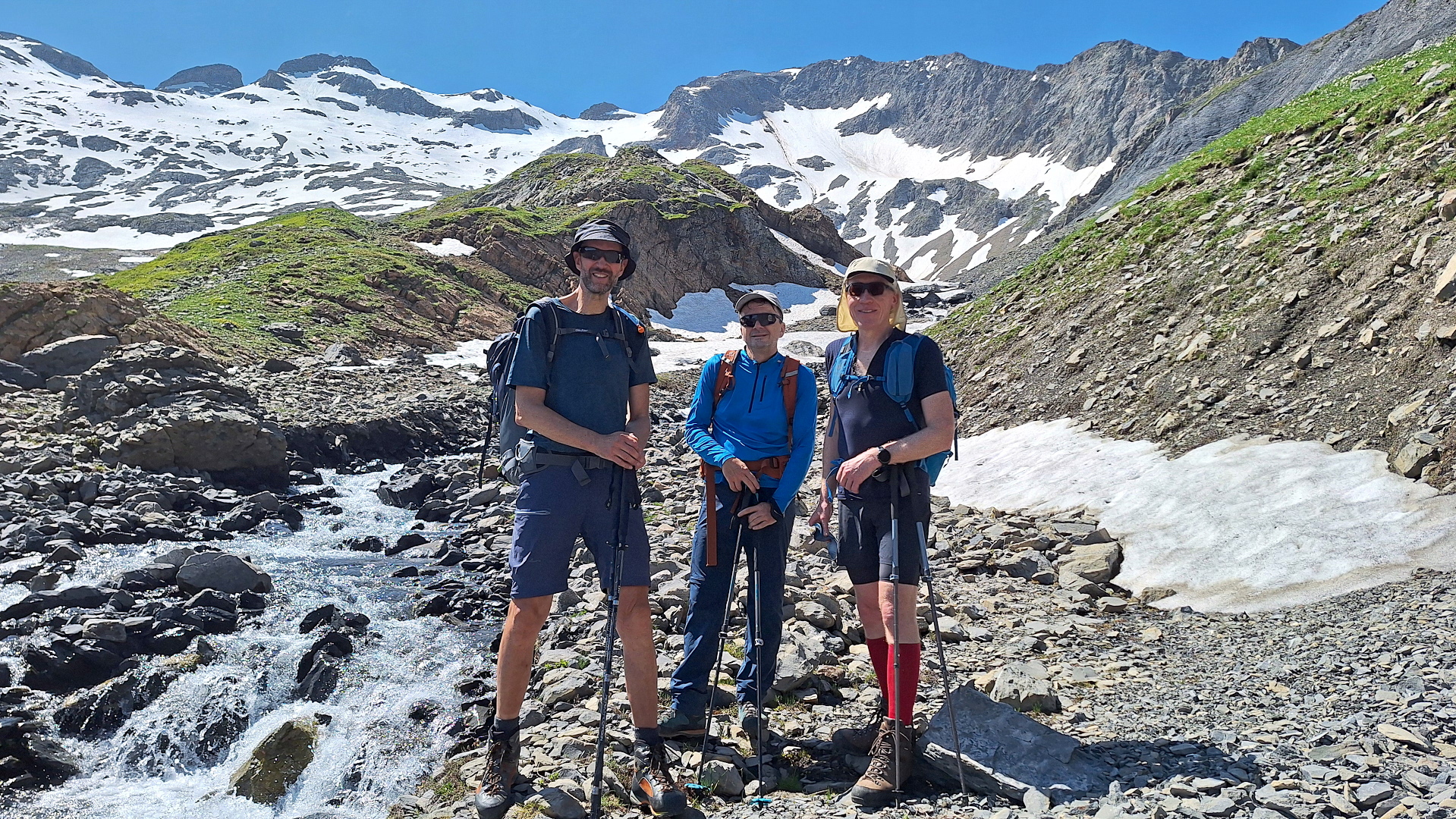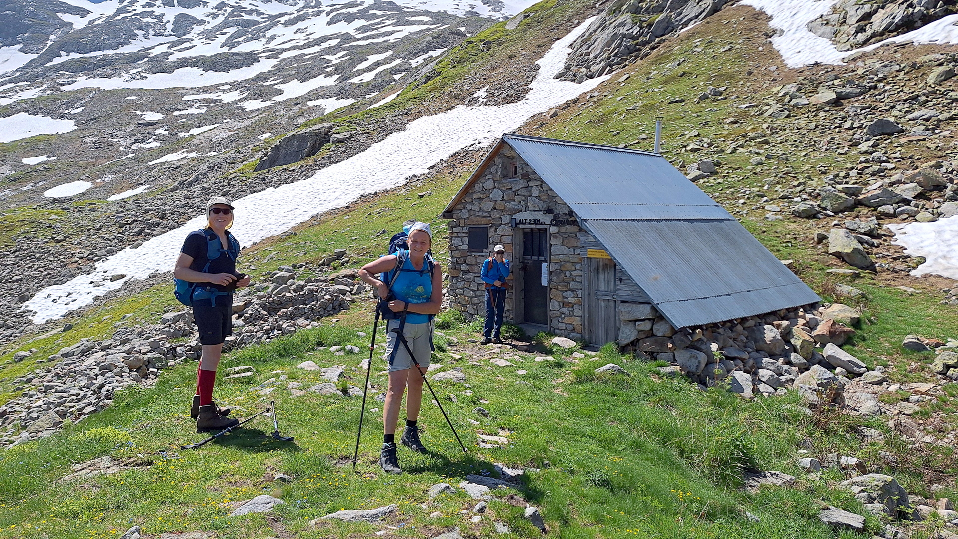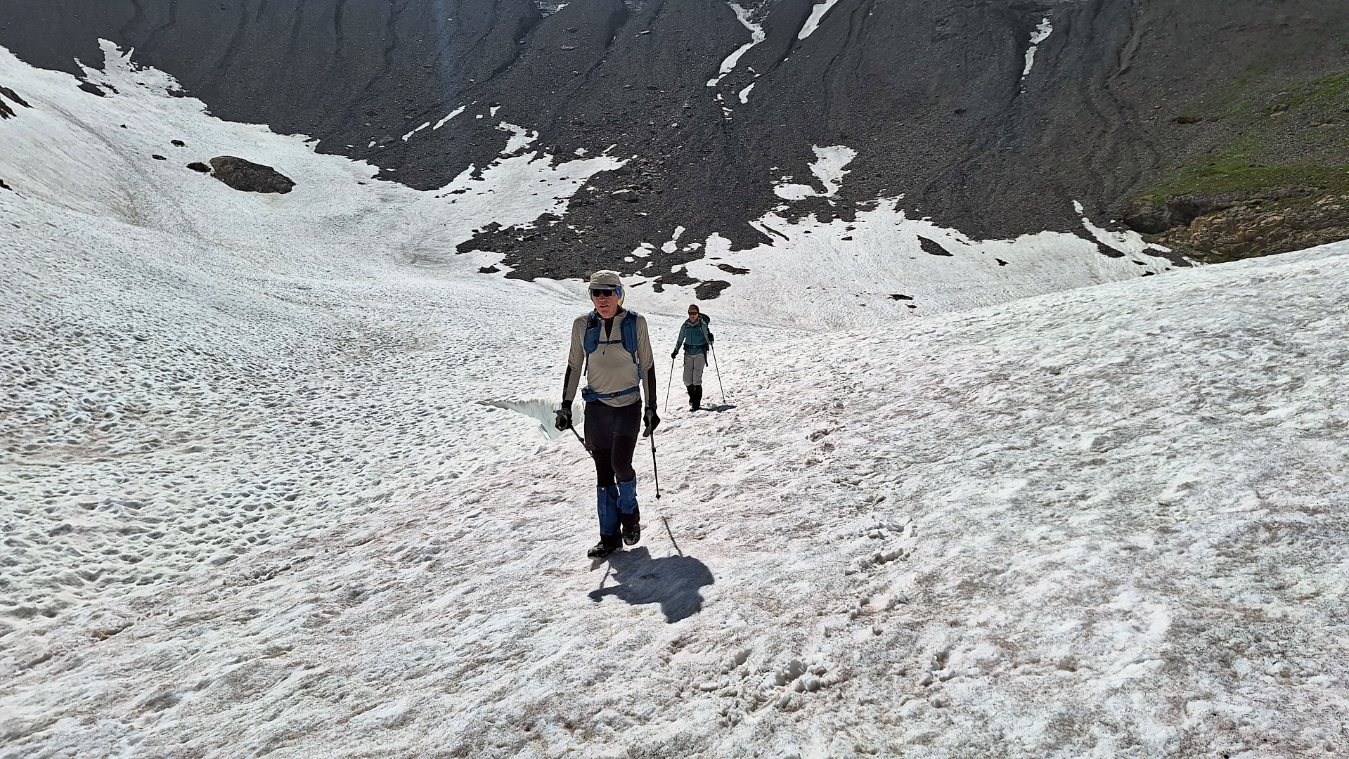 Aber zunächst wanderten wir durch herrliche Wälder, dann über blumenreiche Wiesen (Margot fand tatsächlich einige Blumen, die sie bisher nicht kannte!), an zahlreichen Wasserfällen vorbei, bis wir die kleine Selbstversorgerhütte „Refuge des Sources“ erreichten. Dort füllten wir nochmal unsere Wasservorräte auf, ergänzten den Sonnenschutz und betraten die ersten Schneefelder. Die letzten Tage war es etwas kühler gewesen, und so gewannen wir auf dem trittfesten Schnee schnell an Höhe.