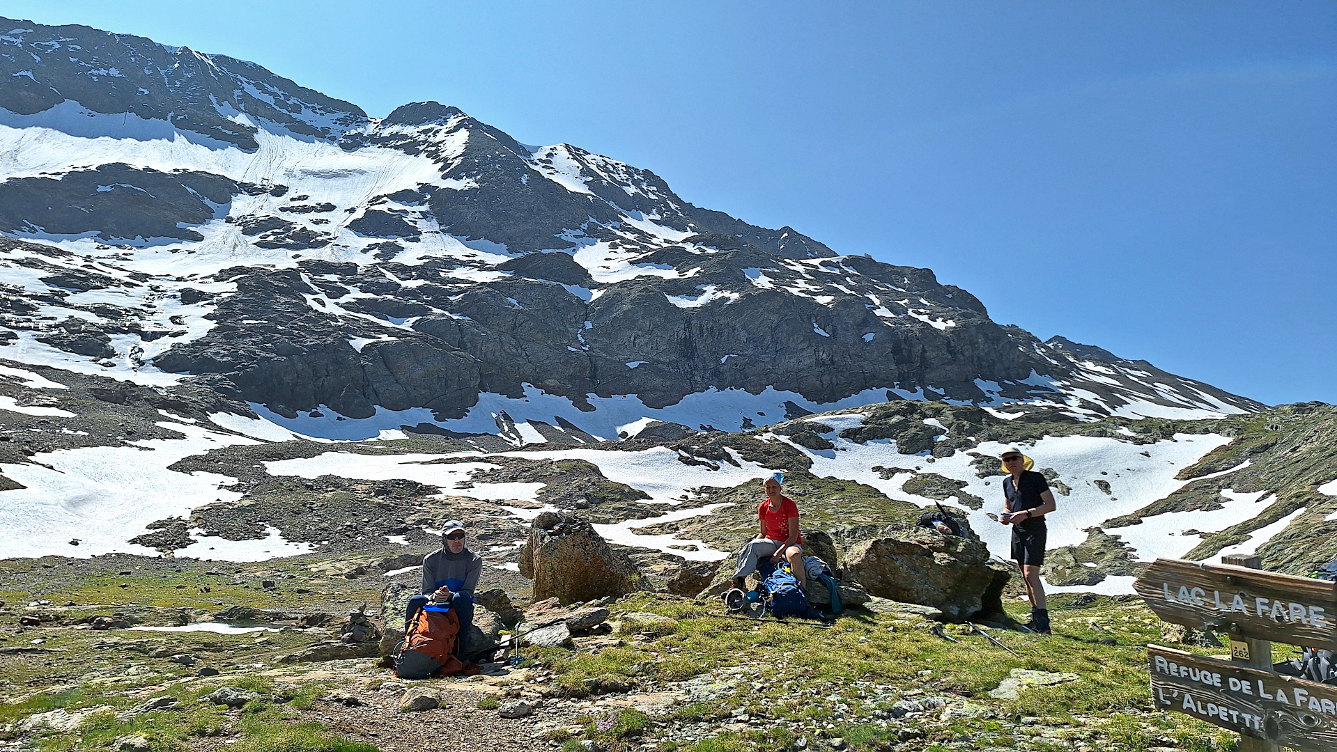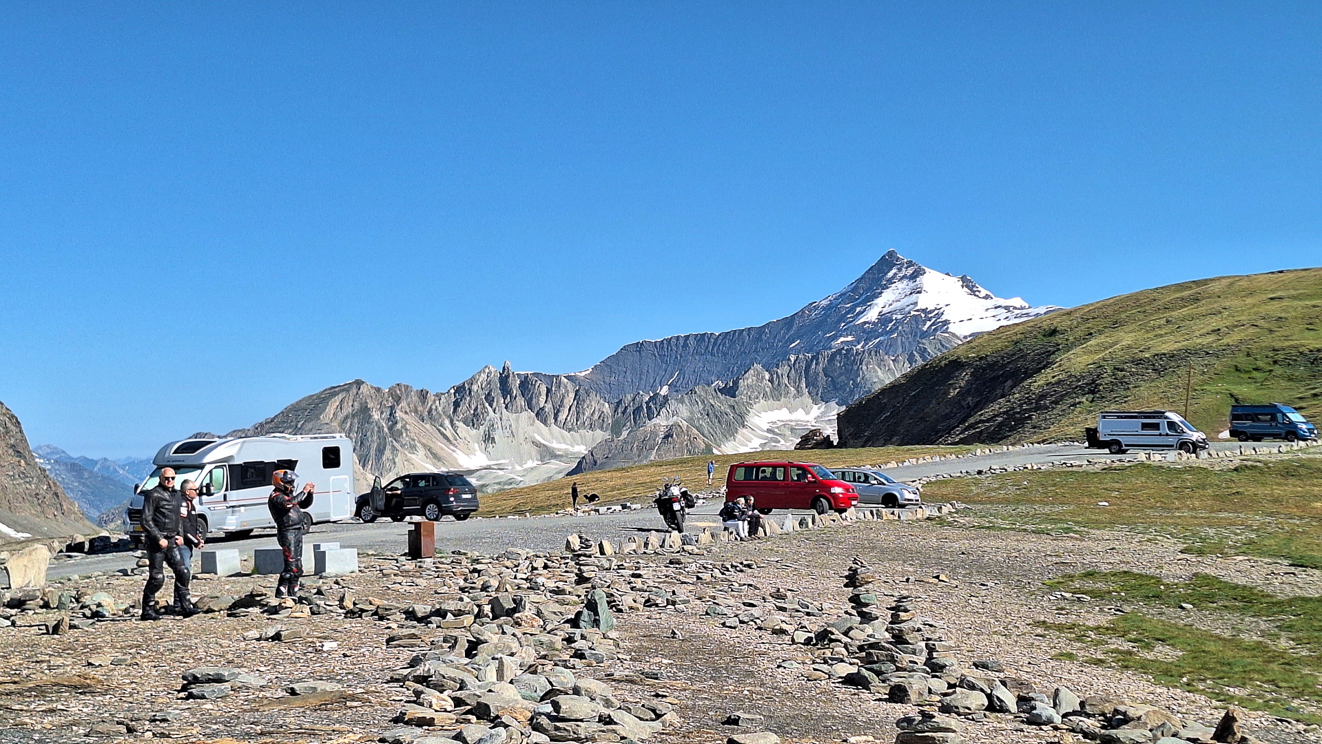 Der Aufstieg zum Signal du Petit Mont Cenis war im Vergleich zu den vorherigen Touren relativ einfach. Ein bisschen Blockkletterei, ein paar Schrofen und ausgesetzte Stellen, einige kleine Schneefelder – und dann waren wir oben. Auch dort hatten wir eine tolle Aussicht, die wir auch ausgiebig genossen. Dann ging’s wieder an den Abstieg und die Einkehr in besagter Hütte. Dieses Mal kamen wir zu zivilen Zeiten in unserem Albergo an, und da die Wettervorhersage für die nächsten beiden Tage nicht sehr gut war, entschieden wir uns, am Samstag schon zurückzufahren und dabei aber die „Scenic Route“ über den Kleinen und Großen St. Bernhard zu nehmen und nicht über die Autobahn. In Vorfreude darauf genossen wir unser letztes Abendessen im Albergo und gingen relativ zeitig ins Bett, da wir wieder einen frühen Start geplant hatten.