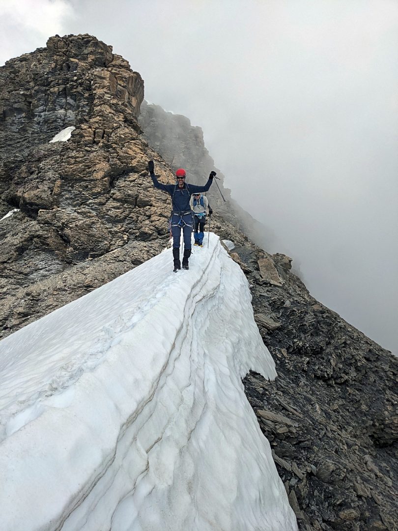 Nun die erste Kletterstelle. Vorsichtig mogelte ich mich über den rutschigen Felsen. Ich versuchte, mich so leicht wie möglich zu machen, um den Schnee nicht loszutreten. Es war einfacher als gedacht. Dadurch bekam ich auch Mut für die nächsten Herausforderungen. Weiter unten auf dem Firngrat wagte ich sogar eine Siegerpose, als Hans uns fotografieren wollte.