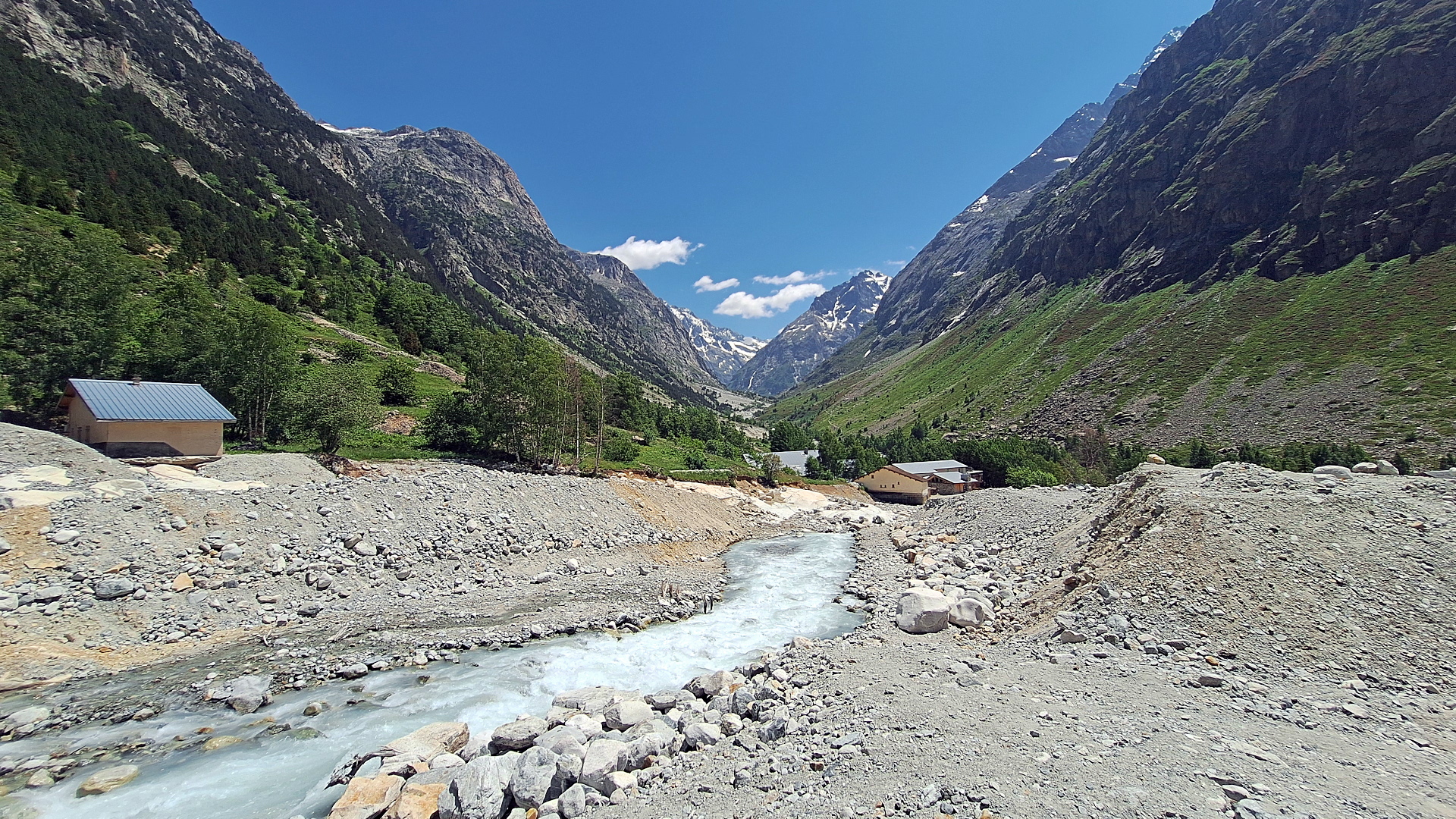 Der heutige Tag war dem Wechseln der Unterkunft und etwas Sightseeing gewidmet. Nach dem Frühstück fuhren wir zuerst noch einmal die wilde und steile Bergstraße zu dem kleinen Örtchen Villard-Notre-Dame hinauf. Dieser Ort ist ganzjährig bewohnt und einen Besuch wert, denn er ist noch sehr ursprünglich und bietet eine wunderbare Aussicht auf die umliegenden Berge – auch auf die beiden Gipfel, die wir in den Tagen zuvor bestiegen hatten. Im Dorfrestaurant entschieden wir uns dann, nach La Bérarde weiterzufahren – einem legendären Dorf mitten in der Dauphiné, das im Jahr 2024 von einem Bergsturz nach einem Unwetter fast vollkommen verschüttet worden war. Das wollten wir uns ansehen. Die Täler in den Westalpen sind ewig lang und die Zufahrten dorthin teilweise ein echtes Abenteuer. Außerdem sind die Bergstraßen oft nur einspurig, bieten aber sehr spektakuläre Tiefblicke. Nach La Bérarde kann man mittlerweile nicht mehr hineinfahren, sondern muss das Auto davor abstellen und es geht auf Schusters Rappen weiter. Es wurden schon Trassen freigeräumt, um in das, was von dem Ort noch übriggeblieben war, zu gelangen, und trotzdem kann man sich das Ausmaß der Zerstörung nicht in seinen wildesten Fantasien vorstellen. Wir waren wirklich sprachlos – die Häuser von meterhohem Geröll und Gestein verschüttet – zum Teil sah man nur noch die Dächer, die Wände zum Teil weggerissen und man konnte in Küche, Bad oder Wohnzimmer sehen – unfassbar! An den Sprüchen auf dem Weg dorthin konnten wir lesen, dass die Bewohner des Dorfes um seinen Wiederaufbau kämpfen. Es bleibt spannend, ob sich das verwirklichen lässt. Wir fuhren das lange Tal wieder zurück und machten uns auf zum Lac du Mont Cenis, der direkt an der Grenze zu Italien liegt und wo wir in einem Albergo eine Unterkunft für die nächsten Tage fanden. Nach einem leckeren Abendessen gingen wir zeitig ins Bett, denn am nächsten Tag stand ja schon die nächste Tour auf die Pointe de Ronce auf dem Programm.