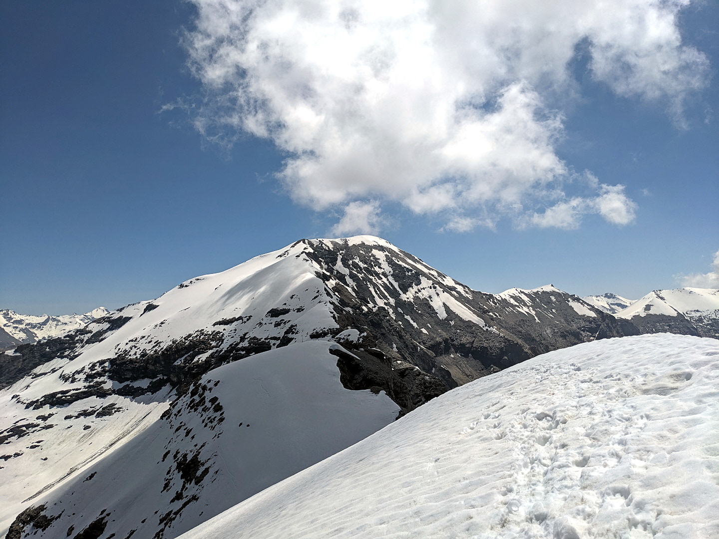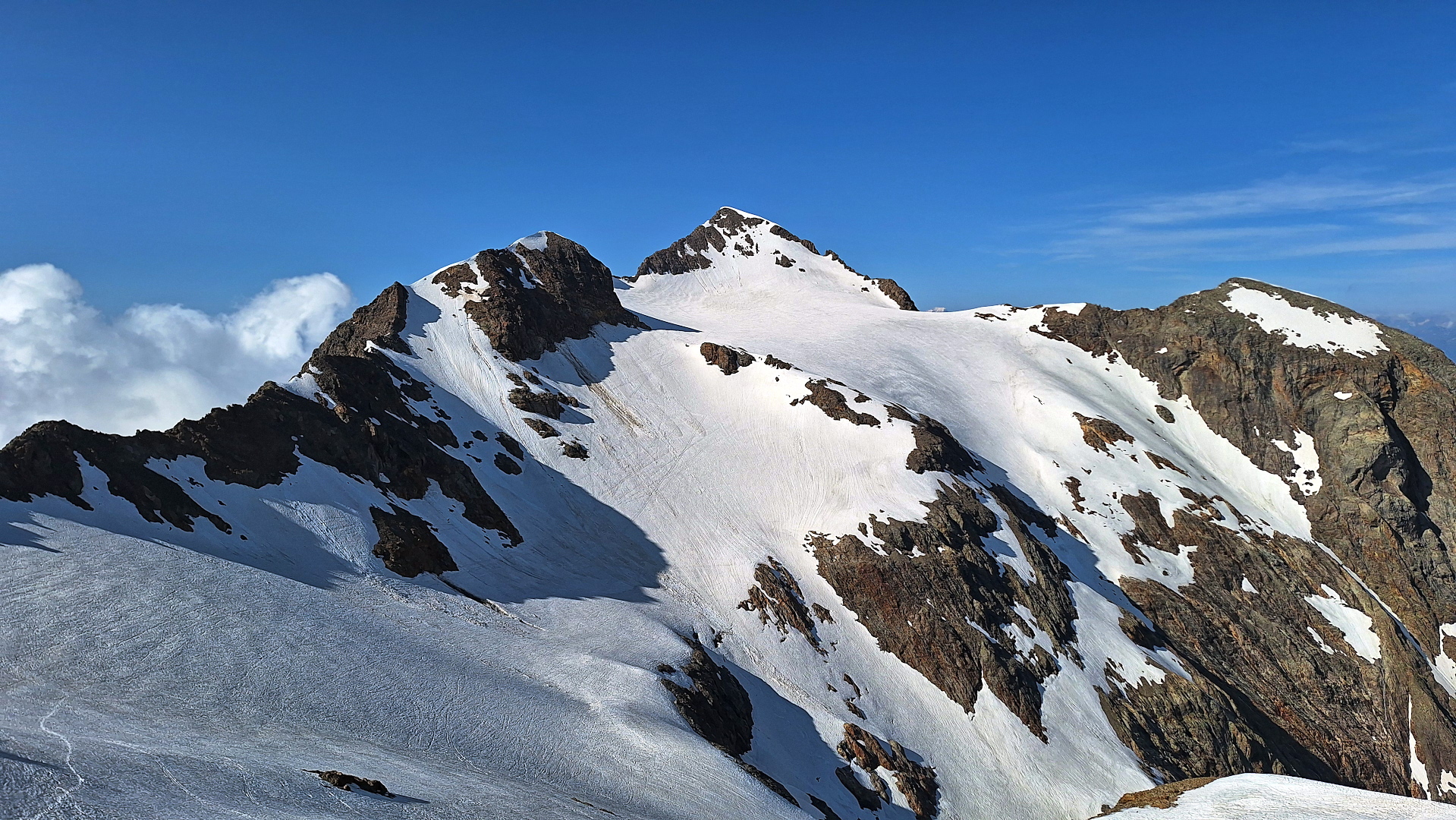 Egal, nun war es Zeit für die Steigeisen, und der Abstieg durch den Schnee in die nächste Scharte begann. Der folgende Felskopf war wieder leicht zu besteigen, und wir erreichten die dritte Scharte. Aber was war das? Senkrechte Felsen versperrten den Weiterweg. Besorgt suchten wir einen möglichen Aufstiegsweg, als wir endlich die feine Spur eines anderen Bergsteigers von vor einigen Tagen entdeckten. Sie führte uns über einen ausgesetzten, rutschigen Felsen auf das Schneefeld, das uns dann über die letzten 300 Höhenmeter zum Gipfel leitete. Als wir gegen 14:00 Uhr endlich dort anlangten, waren wir weitere zwei Stunden seit dem Signal du Grand Mont Cenis unterwegs gewesen, sieben Stunden seit dem Auto. Wie hatte der hikr.org-Autor das nur in nochmal 50 Minuten geschafft? Er musste wohl hinaufgejoggt sein! Sicher hatte er aber weniger mit dem Schnee zu kämpfen, der nun am frühen Nachmittag immer weicher wurde.