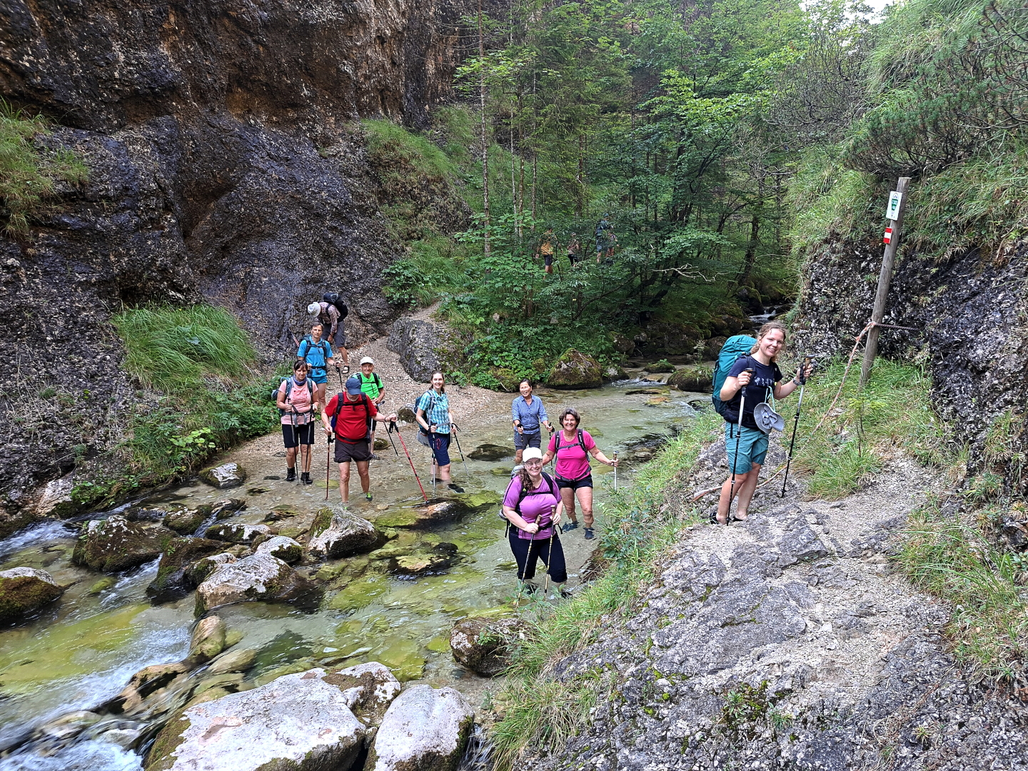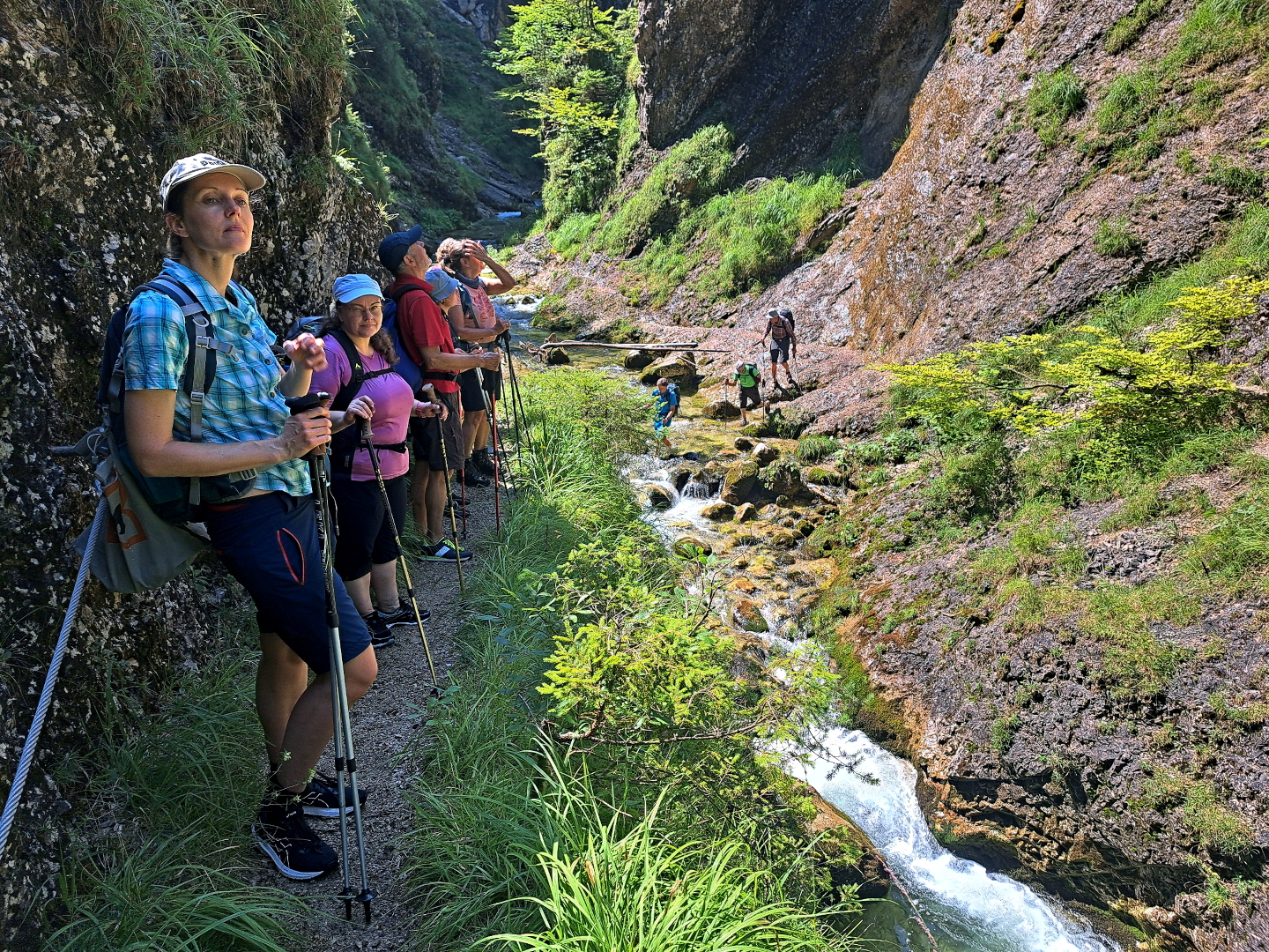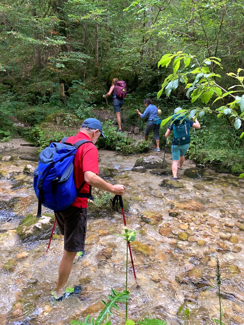 Bei unserer Brotzeit konnten wir dann amüsiert – oder fast besorgt – zuschauen, wie die Teilnehmer einer anderen Wandergruppe mit Badeschlappen oder sogar barfuß sehr ungeschickt zum Fluss abkletterten und ihn mühsam durchquerten.