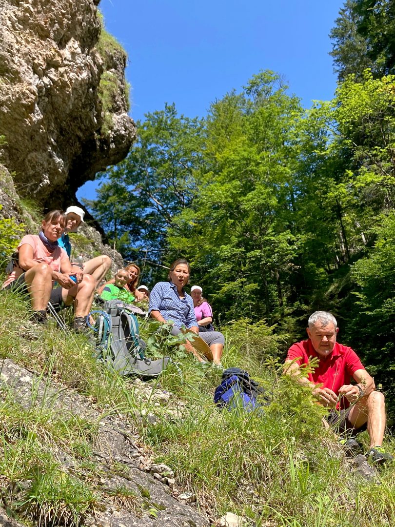 Gut eingestimmt durch mitgebrachte Texte begaben sich die Teilnehmer auf eine wunderschöne Unternehmung mit Margot Morris in der Glemmbachklamm bei Landl. Schon beim Anstieg zum Oberlauf des Gebirgsflusses konnten wir die üppige Pflanzenwelt der Bergwiesen und Waldkräuter bewundern und dank Margots Wissen über Heilpflanzen unsere Kenntnisse erweitern oder auffrischen. Wer weiß denn noch, dass die Kohldistel als Gemüse für die Suppe des armen Mannes hergenommen wurde …
