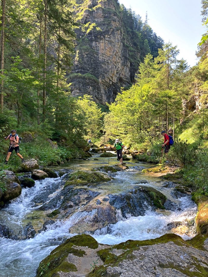 Dann ging es auf einem steilen und unmarkierten Pfad hinab zum Wasser, und die meisten von uns wechselten die Wanderstiefel gegen Turnschuhe, um die insgesamt zehn Bachdurchquerungen und die kleinen Steige entlang der Klamm mit vernünftigem Schuhwerk zu bewältigen. Ganz einsam und mit viel Muße durften wir die abenteuerlichen Steige und die idyllischen Wege am und im Glemmbach genießen. Der Wasserstand war ideal: Es plätscherte sehr munter, sodass wir manchmal bis über die Knie im Bach standen. Bei Hochwasser wäre das tatsächlich ein gefährliches Unterfangen geworden.