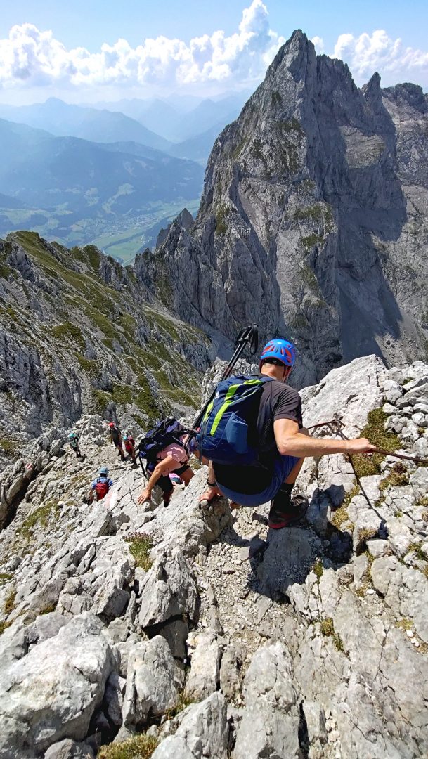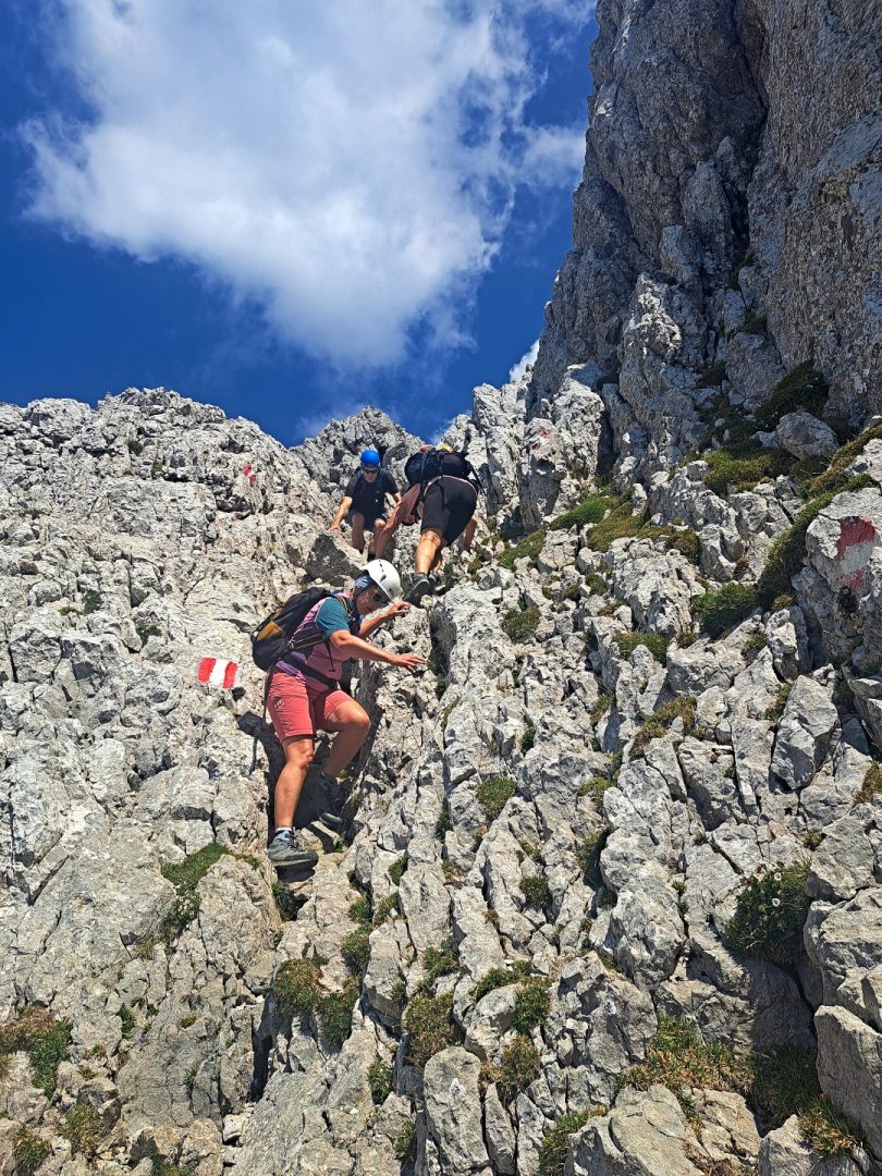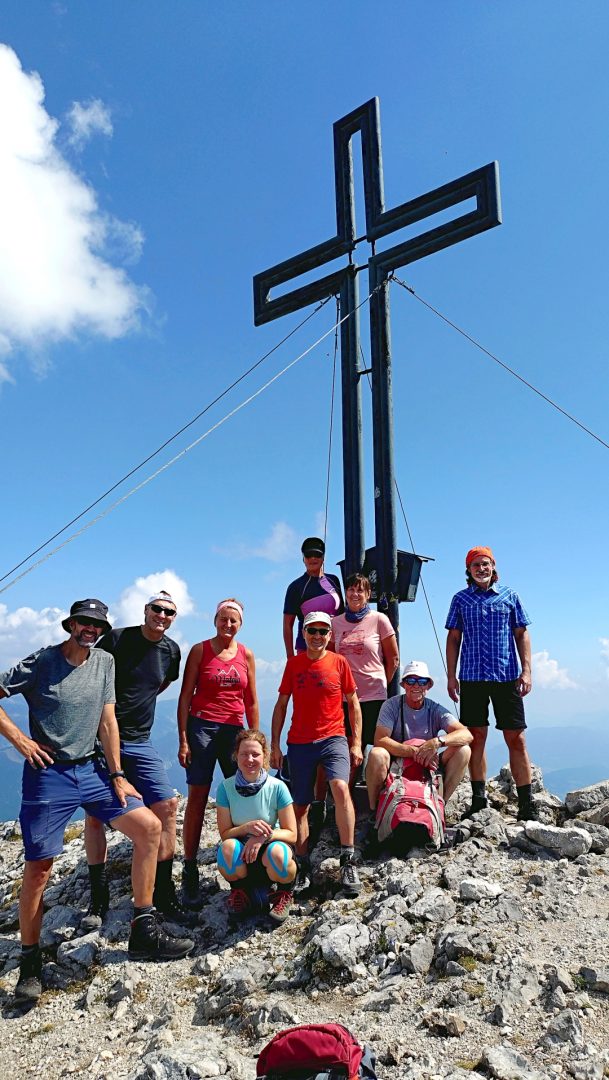 Für die bevorstehenden Tourentage standen nicht ganz alltägliche Ziele in der Steiermark und in Oberösterreich auf dem Programm, zumindest nicht, wenn EBE die Homebase ist. Dementsprechend früh war die Abfahrt um 4 Uhr am Freitagmorgen ab Grafing. Die Versuche einiger Teilnehmer, während der Anreise noch etwas Schlaf nachzuholen, waren mehr oder weniger erfolgreich. Das Ziel für den ersten Tag war der Grimming, welchen wir über die nordseitige „Normalroute“ ab dem Örtchen Kulm (bei Tauplitz) angingen. Bei der Ankunft am Wanderparkplatz gegen 7:30 Uhr war dieser bereits ziemlich voll (aufgrund des perfekten Wetters und des Feiertags gut nachvollziehbar), sodass spätestens jetzt klar war, dass wir nicht allein unterwegs sein werden und wir die Steinschlaghelme sicherlich aufsetzen werden. Bereits zu Beginn ging es ziemlich steil durch den Bergwald hinauf und nach Querung einer Geröllhalde in die erste „Wand“. Der Steig ist ab dieser Stelle dann weitgehend mit Drahtseilen gesichert. Die starke Hang- bzw. Wandneigung sowie die mittlerweile stärker gewordene Sonneneinstrahlung ließen den Flüssigkeitsverbrauch ziemlich ansteigen, sodass die von unserer Tourenleiterin empfohlene Mindestmenge von zwei Litern Trinkwasser definitiv keine Übertreibung war. Auch der weitere Aufstieg über diverse leichte Kletterstellen gestaltete sich durchwegs als ziemlich steil und teilweise sehr ausgesetzt, mit beeindruckenden Tiefblicken. Nach ca. 3½ Stunden standen wir dann ziemlich genau innerhalb der ausgeschilderten Zeit auf dem Gipfel des Grimming. Da dieser praktisch alleine dasteht, bietet sich von dort eine wirklich grandiose Aus- und Rundumsicht an, die wir bei einer ausgiebigen Pause sehr genossen. Danach erfolgte dann der Abstieg auf derselben Route und nahm geländebedingt (ca. zwei Drittel steile Steige mit Kraxelei) fast genauso viel Zeit in Anspruch wie der Aufstieg.