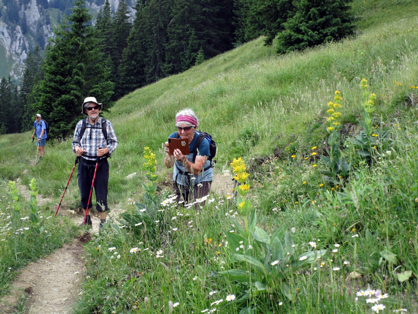Nach einer kurzweiligen Stunde raffen wir uns wieder auf und steigen zunächst mehr oder weniger parallel zur Seilbahntrasse ab. Hier haben wir auch wieder reichlich Gelegenheit, die üppig grünende und blühende Almflora zu bewundern und zu fotografieren. Die unangefochtenen Stars sind die zahlreichen großen Stauden des Gelben Enzians mit ihren vielen leuchtend gelben Blüten und den großen, sattgrünen Blättern. Weiter unten verlassen wir die Trasse der Taubensteinbahn nach rechts und treffen wieder auf den Aufstiegsweg, der uns durch den Wald herunter zum Spitzingsattel führt.