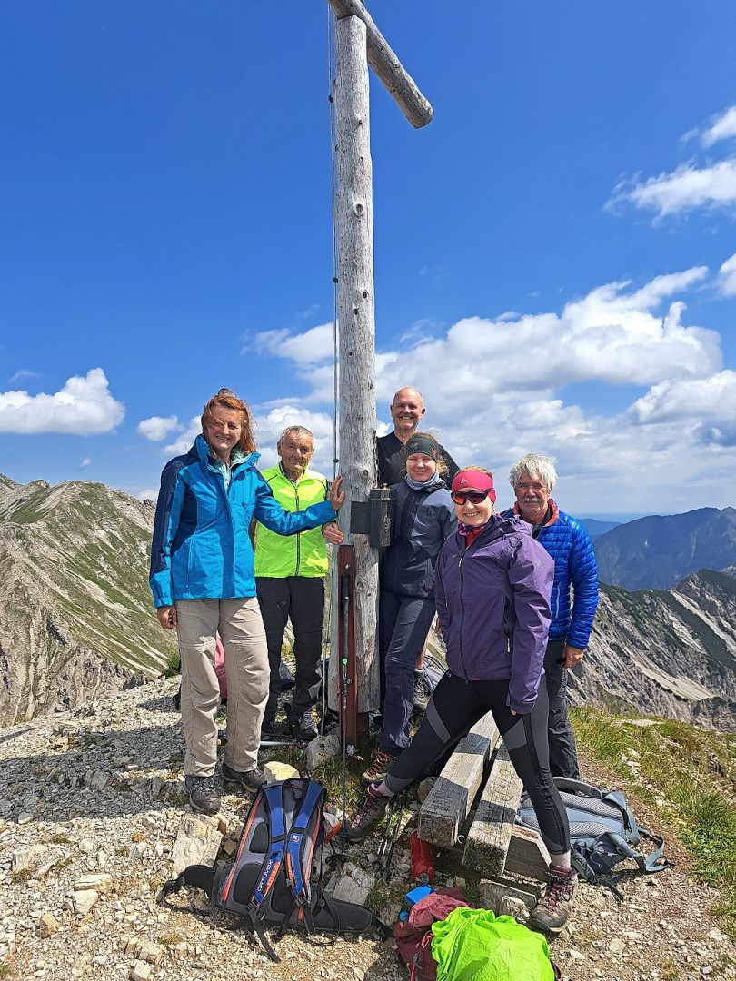 Der Schellschlicht ist ein echter Geheimtipp und eine Beschilderung ist erst mal nicht zu finden. Zunächst ging es erst mal wenige Hundert Meter flach los, bevor wir dann zur Abzweigung auf den unmarkierten Steig kamen. Der Steig zieht sich sehr steil nach oben und wir machten schnell ordentliche Höhenmeter. Der Regen hörte dann nach ca. einer Stunde auf, die Sonne kam hervor und es wurde gleich ordentlich warm. Das erste Stück des Weges führt durch einen wunderschönen Bergwald und zwischendurch konnten wir auch schon den ein oder anderen Blick auf die Zugspitze mit ihren imposanten Felsen erhaschen, die direkt gegenüber von uns steht. Nach ca. 1½ Stunden machten wir eine kurze Pause, um den Ausblick auch etwas genießen zu können. Danach ging es in schroffem Felsgelände mit ein paar ausgesetzten Stellen und kleinen Kraxeleinlagen weiter in Richtung Gipfel. Um ca. 10:30 Uhr standen wir dann alle glücklich am Gipfel des Schellchlichts. Jetzt hatten wir uns eine Pause verdient. Mit Ausnahme von zwei weiteren Bergsteigern, die kurz vor Ende unserer Brotzeit auf dem Gipfel ankamen, waren wir vollkommen alleine unterwegs gewesen – und das sollte auch für den Rest der Tour so bleiben.