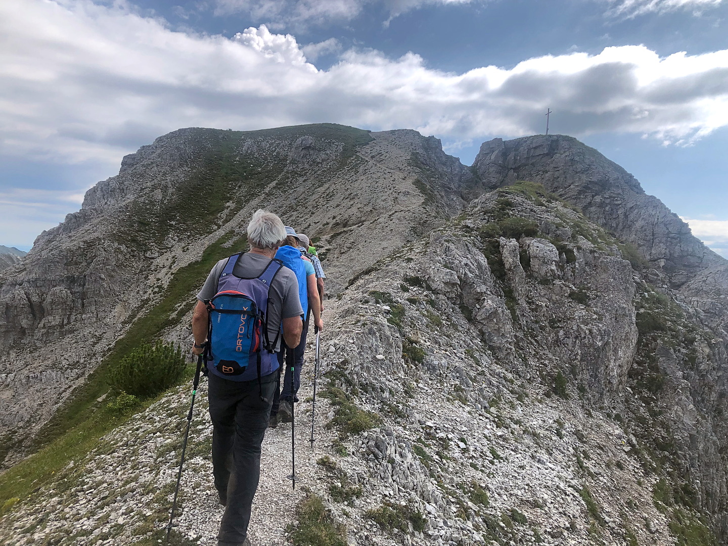 Beim Abstieg ging es ebenso steil bergab, wie es vorher hochgegangen war. Das erste Stück kletterten wir über steiles, teilweise auch ausgesetztes Schrofengelände ab und das schottrige Gestein erforderte unsere volle Aufmerksamkeit und Konzentration. Dabei mussten wir zwei extrem steile Rinnen überqueren, in denen der Weg mittlerweile schon komplett abgerutscht war – das war eine zusätzliche Herausforderung für uns alle, diese Stellen gut und sicher zu meistern. Der Abstieg beeindruckte uns auch mit sehr bizarren Felsformationen.