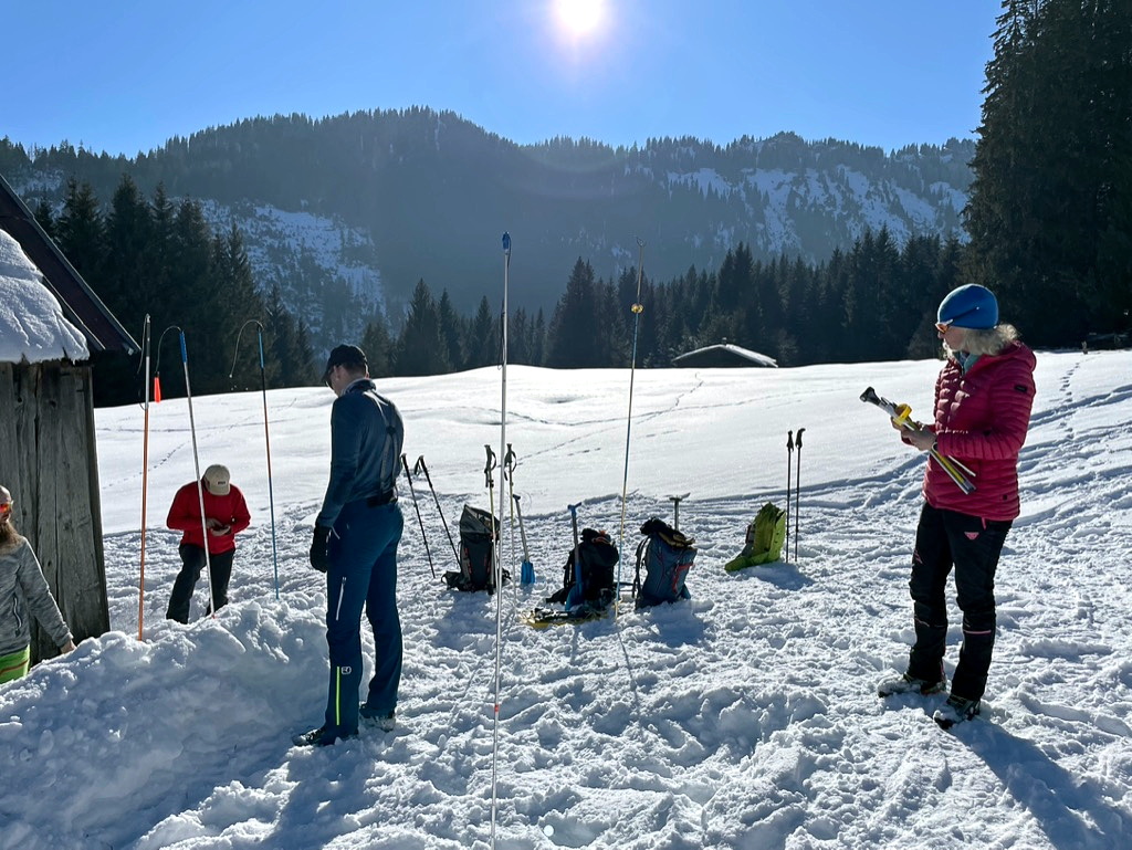 Und dann kommt noch die Prüfungstour. Auf geht’s!!! Spontan wird entschieden, wer die Tour als Führer beginnt. Am Abend zuvor plant die Gruppe die Route anhand der Angaben des Bergführers. Auf der Strecke kommt es spontan zu Wechseln. Gibt es Fragen? Ja, natürlich: Wo sind wir (wo ist der Grashalm?)? Welcher Gipfel ist im Osten zu sehen? Bitte einmal mit dem Kompass rückwärts einschneiden! Aber auch praktische Elemente werden geprüft. Schneedeckenaufbau, Erste-Hilfe-Übungen, Gehtechniken … All diese Inhalte kann man auf einer Tour prüfen, aber man möchte ja eine C-Trainer-Lizenz erwerben. Also gibt es Lehrproben über eine Dauer von 45 Minuten. Die Vorbereitung ist garantiert und dann geht es schon in die Umsetzung. Kurze theoretische Einweisung für die Gruppe und Beantwortung von Fragen. Jetzt heißt es für den angehenden Tourenführer: Transfer der Theorie in die Praxis. Wie gestalte ich eine Unterrichtseinheit so, dass die Kursmitglieder das Erlernte umsetzen können? Kreativität ist gefragt.