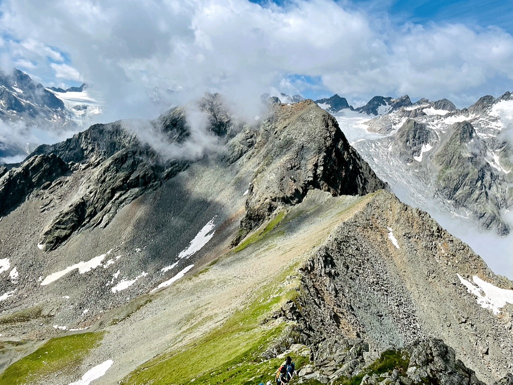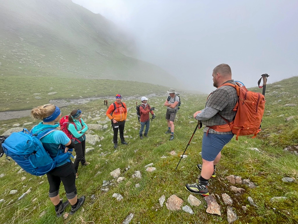 In der Ausbildungswoche ist man viel draußen unterwegs. In den ersten Tagen wollen die Bergführer sehen, ob man den Bergen rein konditionell gewachsen ist. Beim C-Trainer Bergsteigen gab es nie Gipfel unterhalb von 3000 Metern. Es gibt hier und da Pausen, wo theoretische Inhalte in die Praxis vermittelt werden. Das Ziel liegt aber darin, ob man unter Anstrengungen in der Lage ist, eine Gruppe zu führen. Wegfindung, Abgleich mit der Karte, Einschätzung von alpinen Gefahren, Zustand der Gruppe (physiologisch & psychologisch), meteorologische Einschätzung etc. – bin ich konditionell bereit, auf Strecken von ca. sechs bis acht Stunden voranzugehen? Zudem gibt es Notfallübungen und Lehrproben. (i) Ein Gruppenmitglied ist an einem Hang gestürzt. Wie leiten wir eine Erste-Hilfe-Versorgung ein? (ii) Laut Karte gibt es im Osten ein Wildschutzgebiet. Wie verhalten wir uns? Wo gehen wir lang? Und der Klassiker: Wo sind wir aktuell auf der Karte? Da hilft kein Finger, sondern nur ein Grashalm – die Spitze des Halms ist der Seismograph. Es schüttelt mich.